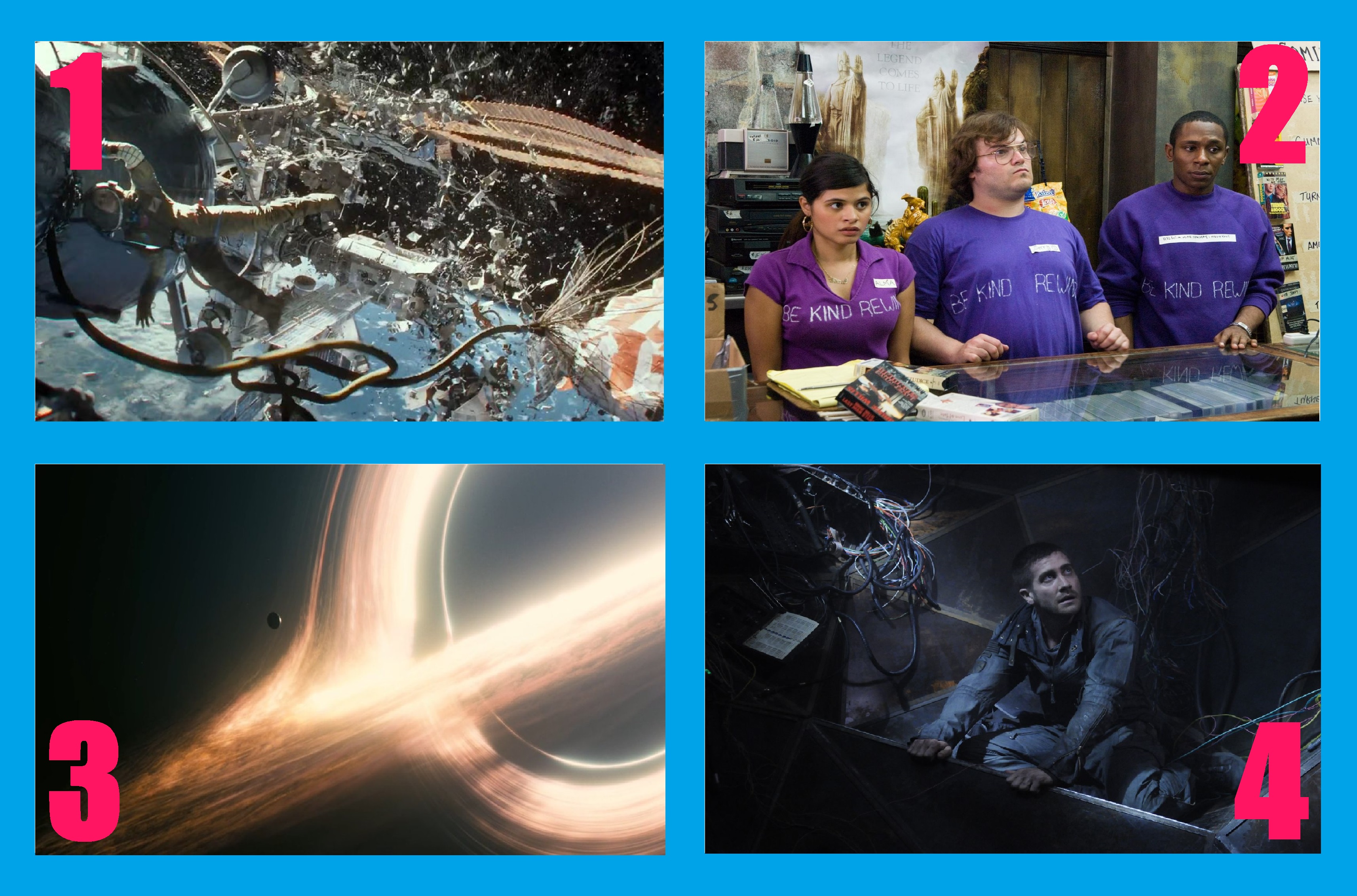 1. “Gravity”- When the satellite they were working on got destroyed, sending a lot of debris into orbit and leaving a hard image to keep track of.