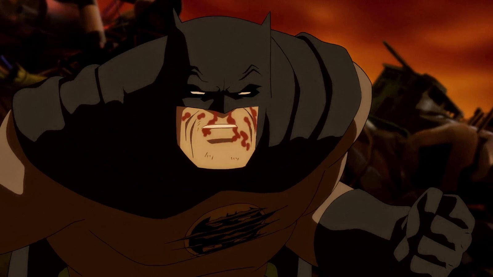 PART ONE– The first part is rather vague in details because of how long his film is so bear with me (I know enough to review the two parts!). In this, we get a grip around what circumstances Bruce Wayne is facing. He’s way past his prime to do what he does and he is forced to show his bat persona to the public when Harvey Dent (Williams) returns and a gang called the Mutants, people who commit crimes out of reason, is rising. Donning the cowl again is a fantastic plot device in this movie and I enjoyed this version of Batman. He has a chin bigger than both of his hands put together, but I love his whole character design and suit. The beginning is a great start. You get a feel for the crisis Gotham is in and with Commissioner Gordon (Selby) resigning in the near future, threat is imminent. For an animated movie it is very adult-oriented in terms of themes and that’s what I think attributes to it best. To see Bruce Wayne and Gordon having drinks at a restaurant and talking about his resignation while discussing threats is a good relief to know that they handle this storyline without goofiness. There are some moments where it can have dark humor, but I have no quarrel with it because it relieves tension while establishing a dark sense of the world that this story takes place in. One portion of this plot I thoroughly enjoy is the Arkham hospital where they try to rehabilitate the clinically insane. This is where Harvey Dent comes in. The doctors that run this joint believe they can be saved and that causes great fear, especially to the viewer. I wanted to punch the main doctor for hating on Batman because of how ignorant he is of the situation at hand is. Harvey Dent was a supple villain in this, but I was disappointed because he had such a minuscule role. He showed up and only had ten minutes of screen time. It can be a con, but to be honest, he makes a point to Batman at the end of his appearance that I really enjoyed. The main bad guy of this story is the Mutants. They are something new to my knowledge and in general, they are rather stupid. All of them are henchmen to a ruler that is more brawn than brain so it is really pointless. I saw no true threat to Batman with them. The idea of what they stand for is interesting and how they can be persuaded to do anything, but they were more of stand-ins for Batman to beat the crap out of. They do however set up an endgame in the second part so they aren’t totally useless. Another thing I will touch up on is the voice acting of the Mutants. All of them seem to have the same guy voicing them which I found funny. Besides that, when it comes to the flow of this story, that is the troubling part. The beginning was a terrific start, like I stated above, but once Harvey Dent came and went, it began to lose traction. The Mutants couldn’t hold up the story, so I had to wait until it cut to Bruce Wayne dealing with his inner guilt or news broadcasts displaying the burning argument of whether Batman should be considered a good or bad guy. Once it got towards the ending and Batman creates a great plan with Gordon, that’s when it starts to get good again. Don’t get me wrong, some scenes with the Mutants were good (like when Batman crashed their junkyard party), but overall they didn’t do well. In the end, this was a well-perceived start that provided a ingenious theme that did justice to the lousy foes. It has a great story overall and I enjoyed it! PART SCORE: 83%= Juicy Popcorn