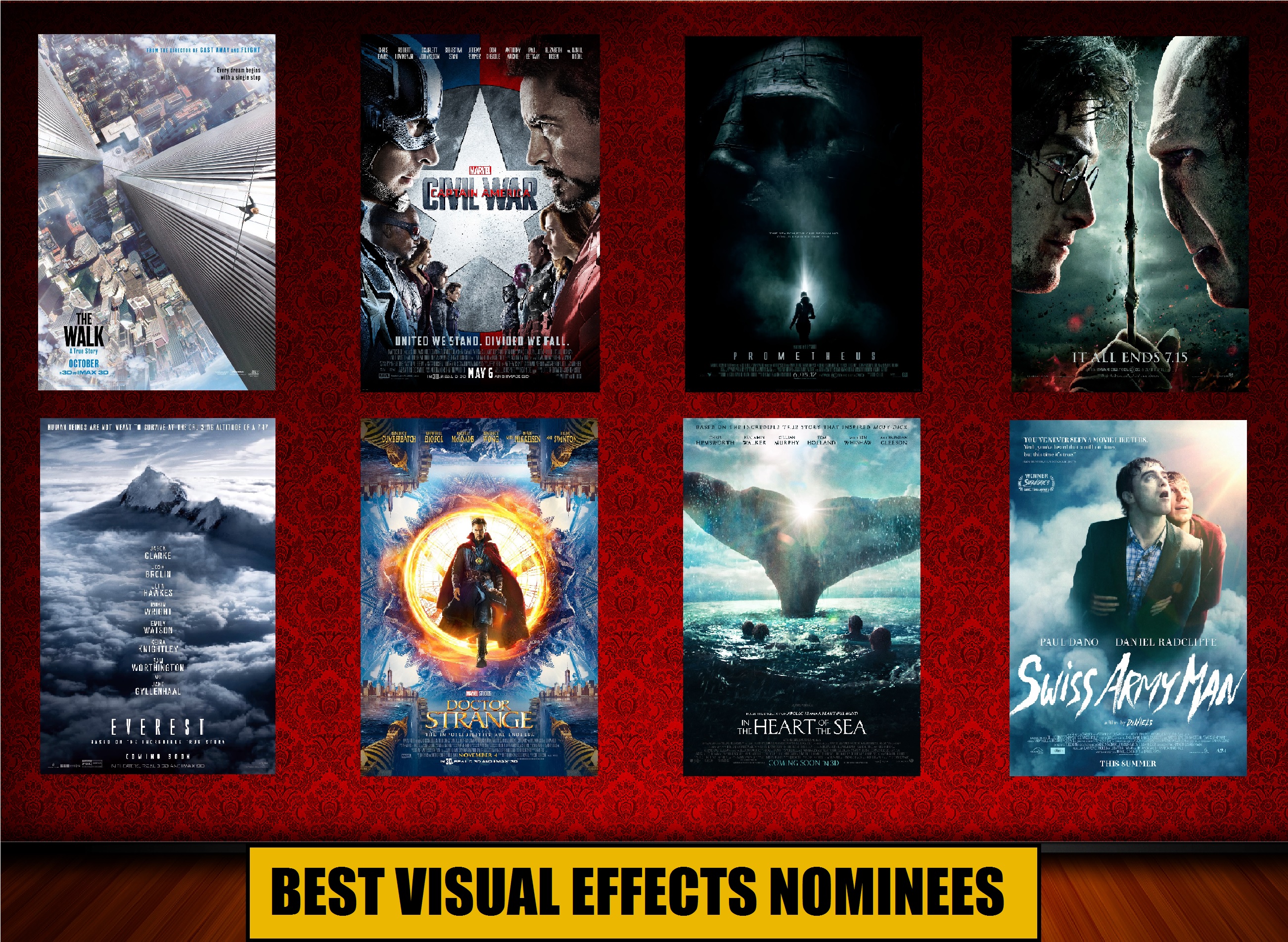 Juicy Awards IV- Best Visual Effects Nominees January 6, 2017 · by Harrison · in Juicy Awards IV. · BEST VISUAL EFFECTS NOMINEES: “The Walk” “Captain America: Civil War” “Prometheus” “Harry Potter and the Deathly Hallows: Part 2” “Everest” “Doctor Strange” “In the Heart of the Sea” “Swiss Army Man” Share this: Click to share on X (Opens in new window) X Like Loading... Related