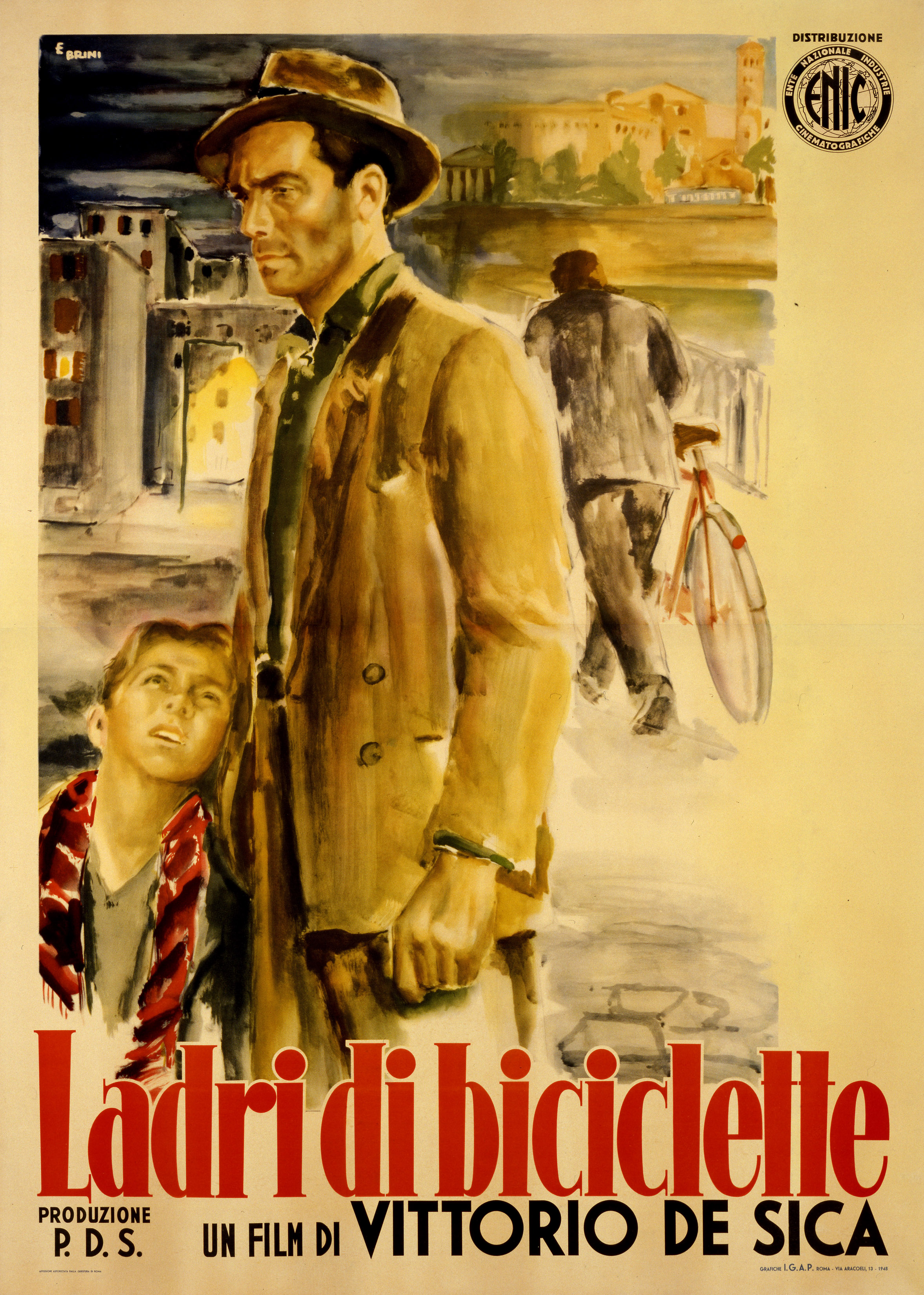 his site has been rather light on foreign films, as I believe that I never reviewed a single one in my four-year tenure here. Finding a way to view movies made by other countries is difficult, more so than seeing a new release without going to the theater (which I don’t do). There’s hardly an outlet for me to watch them, but thankfully I was given an opportunity when “Bicycle Thieves” was assigned to me in my film history class. Italian Neorealism was a huge movement in Italy around the mid-40s to early 50s, being deemed as a “golden age” of its cinema. Movies stressing the genre would present a story that is realistic, typically shot in actual locations instead of backlots, and usually containing an ending with no resolution. “Bicycle Thieves” is the most prominent of the crop raised during that time, and for obvious reasons after watching it. What makes the feature stand out is how it still holds up to this day, as I can understand the conflict the main character is having without looking too deep into the story’s context. Set in post-World War II Rome, this plot is fleshed out in a bleak atmosphere. Almost everyone is just scraping by, scrambling to get a job so they can feed their families. Our hero, the main character, is like the rest of them; down to our level. Watching this was as if I was walking into someone’s life and seeing it play out for a little over an hour. Everything that happened could’ve happened in real life, and the writers didn’t try to expand their narrative to unrealistic means. When it comes to films like these, I generally give them solid ratings, however I hardly ever deem them fantastic. “Bicycle Thieves” contains all that you would find in an Oscar contender for a drama. The acting is marvelous, though I had to read their delivery in subtitles, the setting is interesting, and something sad has to happen. We all know the criteria that these releases hold, but this one in particular takes another step forward. How? It leaps out of the box. Sure, the story is as basic as a man trying to find his bike, with his son in tow, but there’s much more to that. This is a tale of what was thought to be a breakthrough ending up taking many wrong turns. Just when our hero gets close to fixing his problem, trouble arises and he falls further and further behind from reaching his goal. Some may find it saddening, others may see it as a “master strategy” just because it’s an old foreign movie. Although I find it to be a saddening venture, it is artistic and holds weight to the message this film is trying to exhibit. Not every story should be structured how WE want it. Otherwise, there’s not originality nor outlet for filmmakers to express themselves or a story they want. The people who made this wanted to tell a realistic tale; one that brought audience members closer to reality rather than giving them an escape. Many would hate this factor, especially the ending, however I respectfully enjoyed this release. The dialogue was engaging for a movie about hunting down a bike, and the character development, while subtle, worked wonders in fleshing out life during that time in Rome. It was as if I was watching a documentary of that decade with added narrative to keep things interesting. The pacing of this story was pretty consistent, with only a few parts being a little slow. Overall I thought this was a film that held up to its status. I had no idea what I was getting into, and I will say that there wasn’t a moment of predictability in this. The ending takes a shocking turn, and how you view it essentially defines whether you like the movie or not. As for me, I felt reserved. Though I was not all on board for how things wrapped, I commend the writers for doing something new (or utterly realistic). Watching this foreign flick gives me hope for others. There are many artists out there, especially when going back in time to the early workings of film, and they all have a story to share. This one in particular was simple, yet jarring, and I found myself taking enjoyment from it. If you are looking to reach outside the U.S. for fresh entertainment, I’d point you out to this (unless you are mainly into films Hollywood churns out nowadays). FINAL SCORE: 92%= Juicy Popcorn