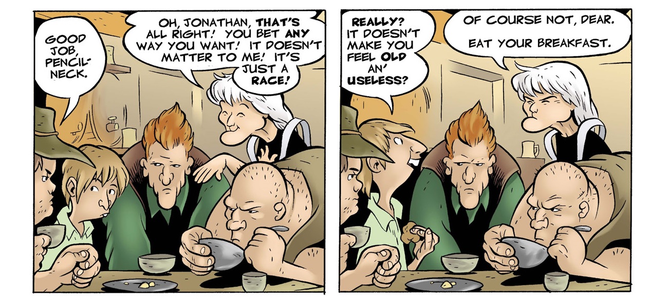BONE 25th ANNIVERSARY REVIEW: “The Great Cow Race” is a collection of comics written and illustrated by Jeff Smith (Rasl, Shazam!: The Monster Society of Evil) and published in 1996. This colored version was published in 2005 by Scholastic, with the colorist being Steve Hamaker. Barrelhaven’s annual cow race has arrived, and Fone Bone is looking for a chance to woo Thorn. Elsewhere, Phoney Bone formulates a new scheme in order to earn a high reward off of the townsfolk and dig himself out of his debt.