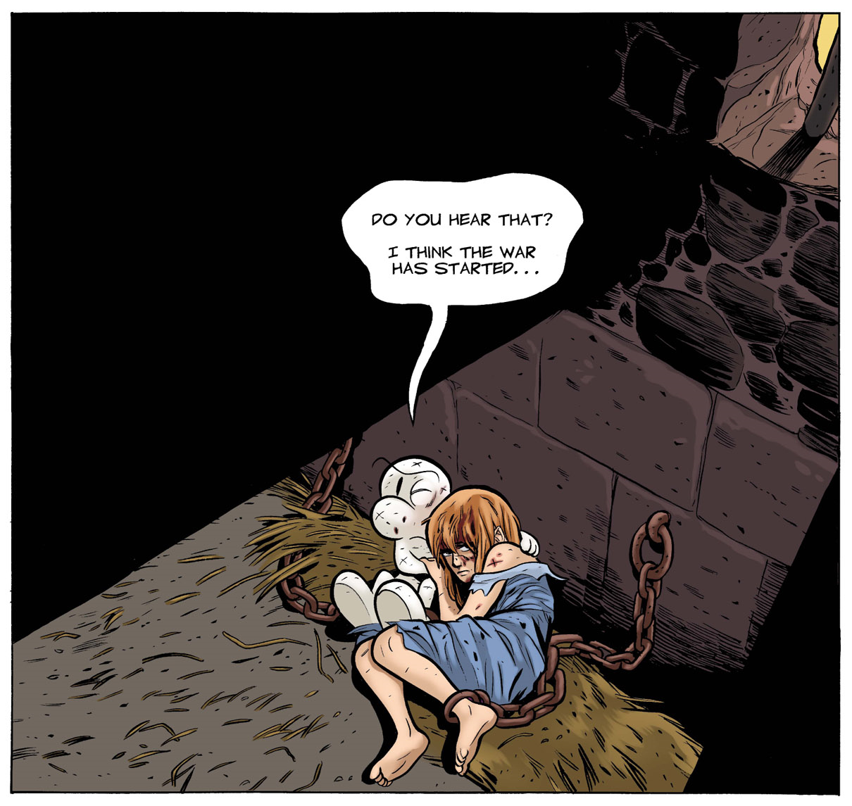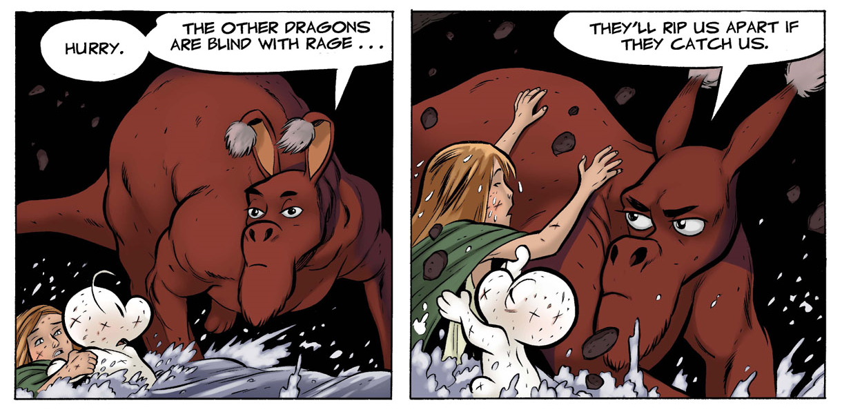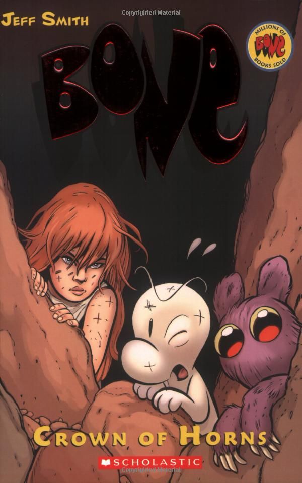 BONE 25th ANNIVERSARY REVIEW: “Crown of Horns” is a collection of six comics written and illustrated by Jeff Smith (Rasl, Shazam! The Monster Society of Evil) and published on April 25, 2004. This colored version was published in 2009 by Scholastic, with the colorist being Steve Hamaker. The war between the Lord of the Locusts and the Veni-Yan has commenced as everything comes crashing down. As Grandma Ben rallies forces against the rat creatures, Fone Bone and Thorn must find a way out of prison in order to find the sacred Crown of Horns and stop the Lord of Locusts from rising.