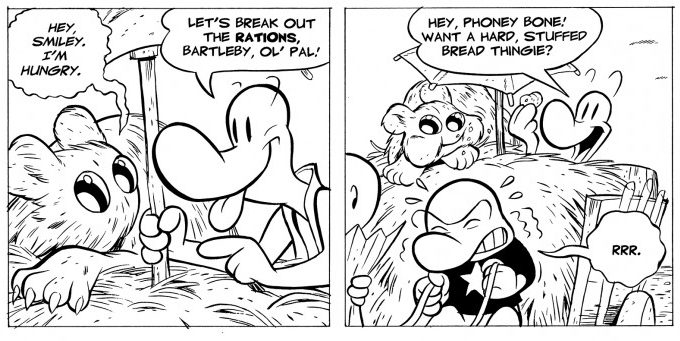 BONE 25th ANNIVERSARY REVIEW: “Bone: Coda” is a 120 page graphic novel composed of a new Bone chapter written and drawn by Jeff Smith (Rasl, Tuki: Save the Humans), and a Bone companion, written by comics librarian and historian, Stephen Weiner (The Hellboy Companion, The 101 Best Graphic Novels). Along with these two, the book also contains an informative entry of the beginnings of “Bone” as well as an interview with Jeff Smith.