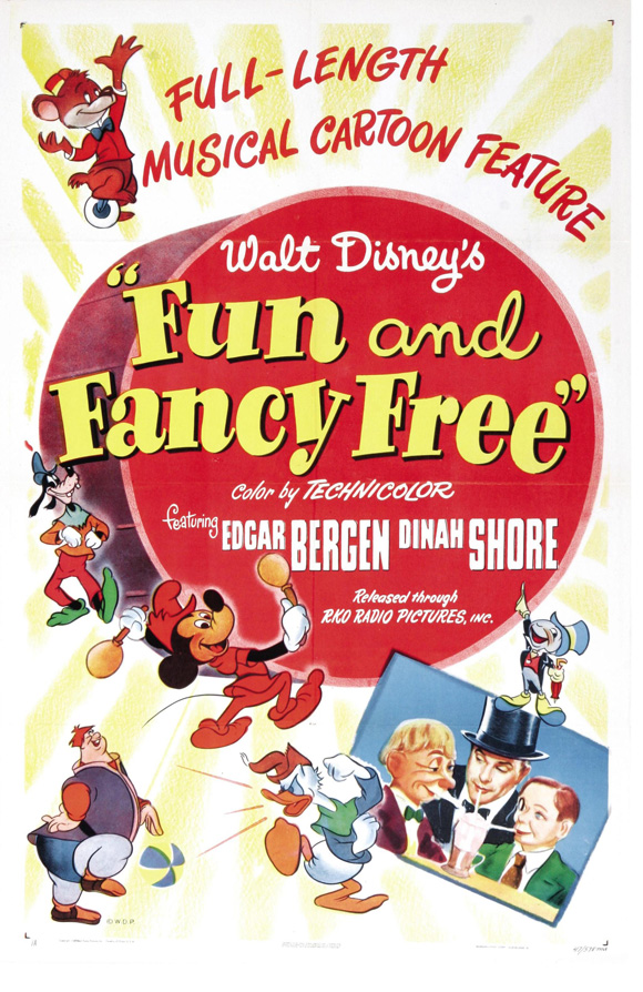 NOSTALGIA LANE MOVIE REVIEW: Our first stop in this kiddish marathon is “Fun and Fancy Free,” which stars Edgar Bergen (I Remember Mama, Charlie’s Haunt), Dinah Shore (Dinah! [TV series], Aaron Slick from Punkin Crick), Charlie McCarthy (Stage Door Canteen, You Can’t Cheat an Honest Man), Mortimer Snerd (Charlie McCarthy Detective, A Neckin’ Party), Luana Patten (Song of the South, Home from the Hill), and the voice work of Walt Disney (The Mickey Mouse Club [TV series], Fantasia), Anita Gordon (Paint Your Wagon, State Fair), Cliff Edwards (His Girl Friday, Gone with the Wind), Billy Gilbert (The Great Dictator, His Girl Friday), Clarence Nash (The Three Caballeros, Mickey’s Christmas Carol), and Pinto Colvig (Bozo’s Circus [TV series], Sleeping Beauty). It was written by Homer Brightman (Cinderella [1950], Bozo: The World’s Most Famous Clown [TV series]), Harry Reeves (The Adventures of Ichabod Crane and Mr. Toad, Saludos Amigos), Ted Sears (Snow White and the Seven Dwarfs, Peter Pan [1953]), Lance Nolley (Bongo [Short], Paul Bunyan [Short]), Eldon Dedini (Walt Disney’s Wonderful World of Color [TV series]), and Tom Oreb (Alice in Wonderland [1951], Make Mine Music [Short]). This movie is a collection of two shorts: “Bongo,” the story of a circus bear who escapes into the wild; and “Mickey and the Beanstalk,” a twist on the folk tale involving Mickey (Disney), Donald (Nash), and Goofy (Colvig).