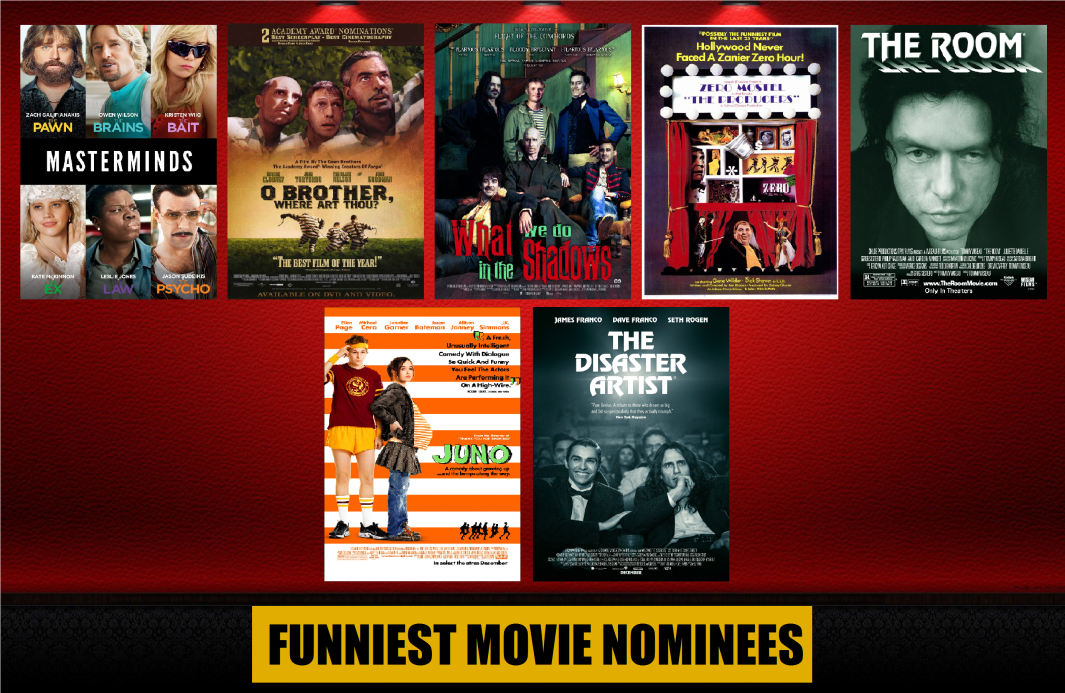 Juicy Awards V- Funniest Movie Nominees January 10, 2018 · by Harrison · in juicy awards V. · FUNNIEST MOVIE NOMINEES: “Masterminds” (2016) “O Brother, Where Art Thou?” “What We Do in the Shadows” “The Producers” (1967) “The Room” “Juno” “The Disaster Artist” Share this: Click to share on X (Opens in new window) X Like Loading... Related