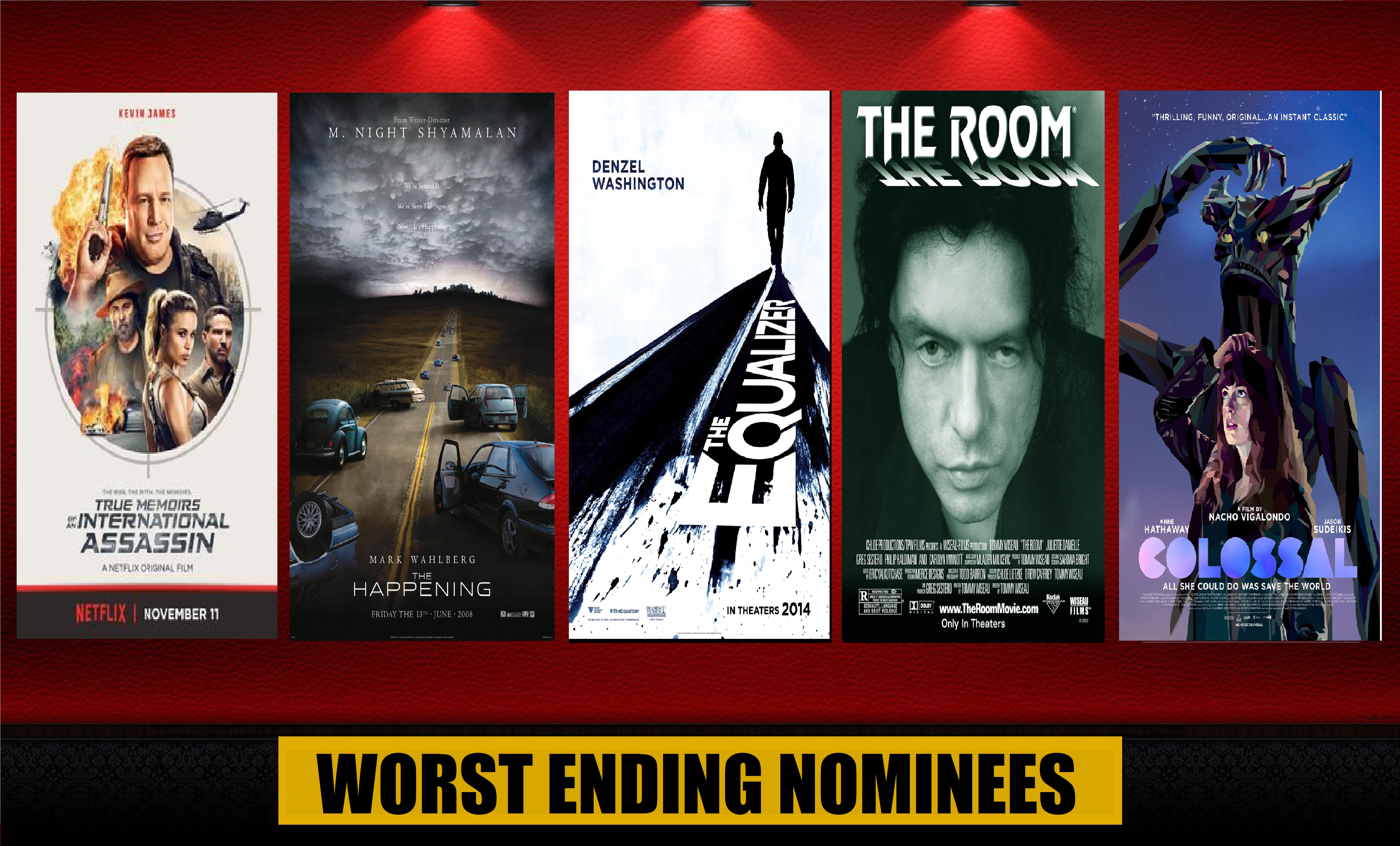 Juicy Awards V- Worst Ending Nominees January 21, 2018 · by Harrison · in juicy awards V. · WORST ENDING NOMINEES: “True Memoirs of an International Assassin” “The Happening” (2008) “The Equalizer” (2014) “The Room” “Colossal” Share this: Click to share on X (Opens in new window) X Like Loading... Related