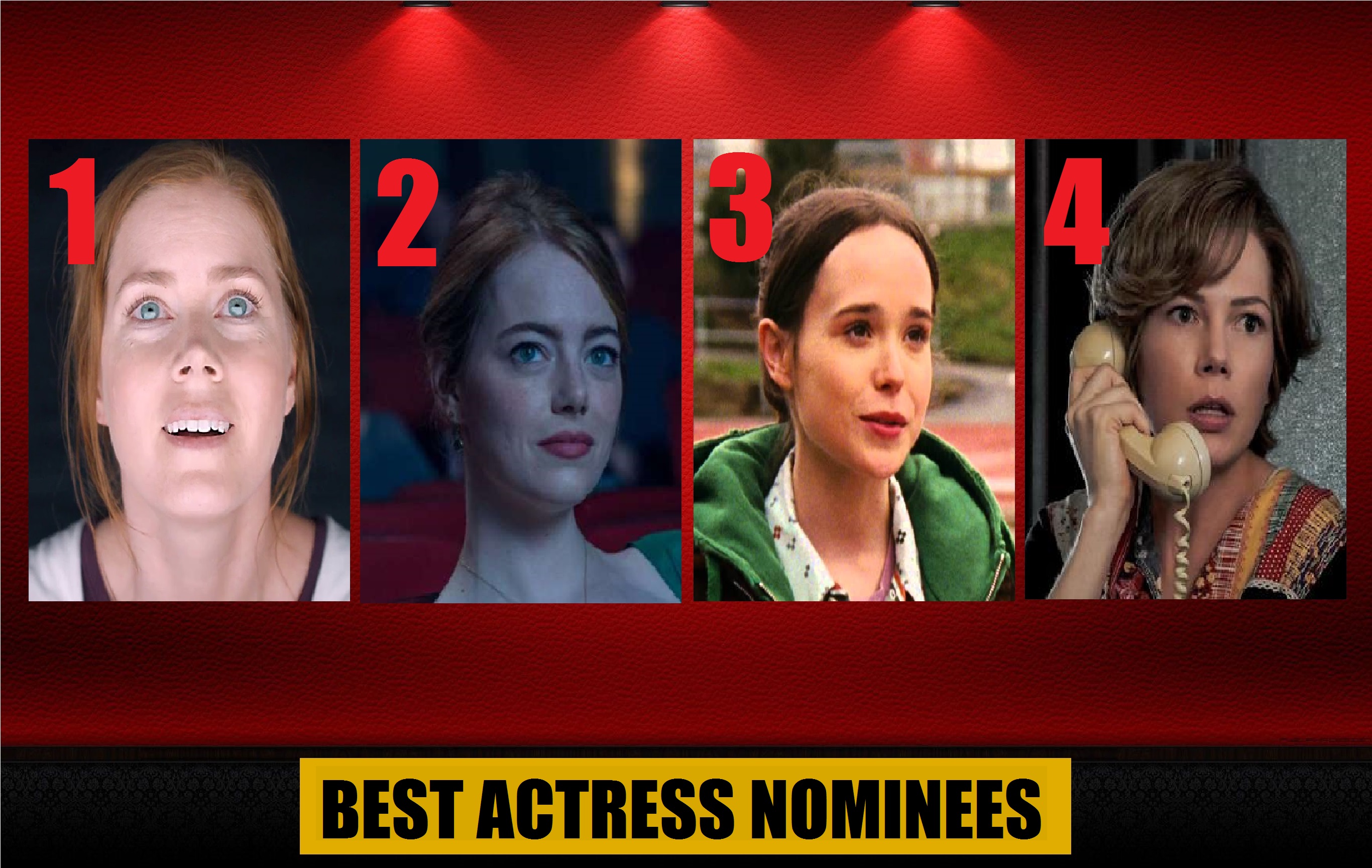 Juicy Awards V- Best Actress Nominees January 26, 2018 · by Harrison · in juicy awards V. · BEST ACTRESS NOMINEES: Amy Adams as Dr. Louise Banks (“Arrival”) Emma Stone as Mia (“La La Land”) Ellen Page as Juno (“Juno”) Michelle Williams as Gail Harris (“All the Money in the World”) Share this: Click to share on X (Opens in new window) X Like Loading... Related