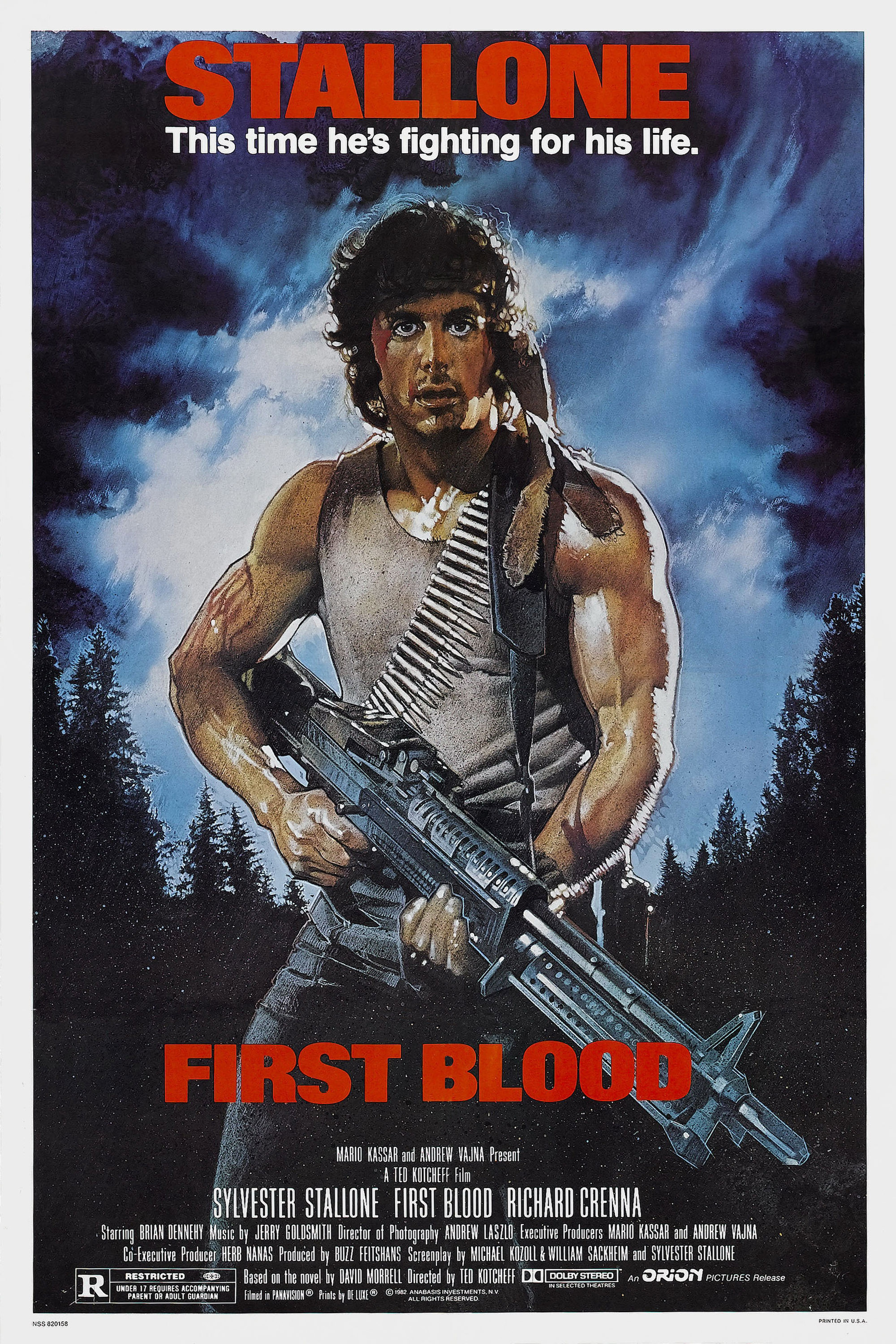 RAMBO WARRIOR MOVIE REVIEW: “First Blood” stars Sylvestor Stallone (Rocky, Escape Plan), Richard Crenna (The Flamingo Kid, Table for Five), Brian Dennehy (Ratatouille, Silverado), Bill McKinney (Deliverance, The Outlaw Josey Wales), Jack Starrett (Blazing Saddles, Family Reunion), Michael Talbott (Vacation, Miami Vice [TV series]), Chris Mulkey (Whiplash, Cloverfield), John McLiam (Sleeper, In Cold Blood), Alf Humphreys (X-Men 2, My Bloody Valentine), and David Caruso (Session 9, Proof of Life). It is directed by Ted Kotcheff (Weekend at Bernie’s, Winter People) and written by Michael Kozoll (Hill Street Blues [TV series], McCloud [TV series]), William Sackheim (Border River, Forbidden), and Sylvestor Stallone. Based on a novel, former Green Beret John Rambo (Stallone) returns to the States only to be pursued by a small town police force for no probable cause.