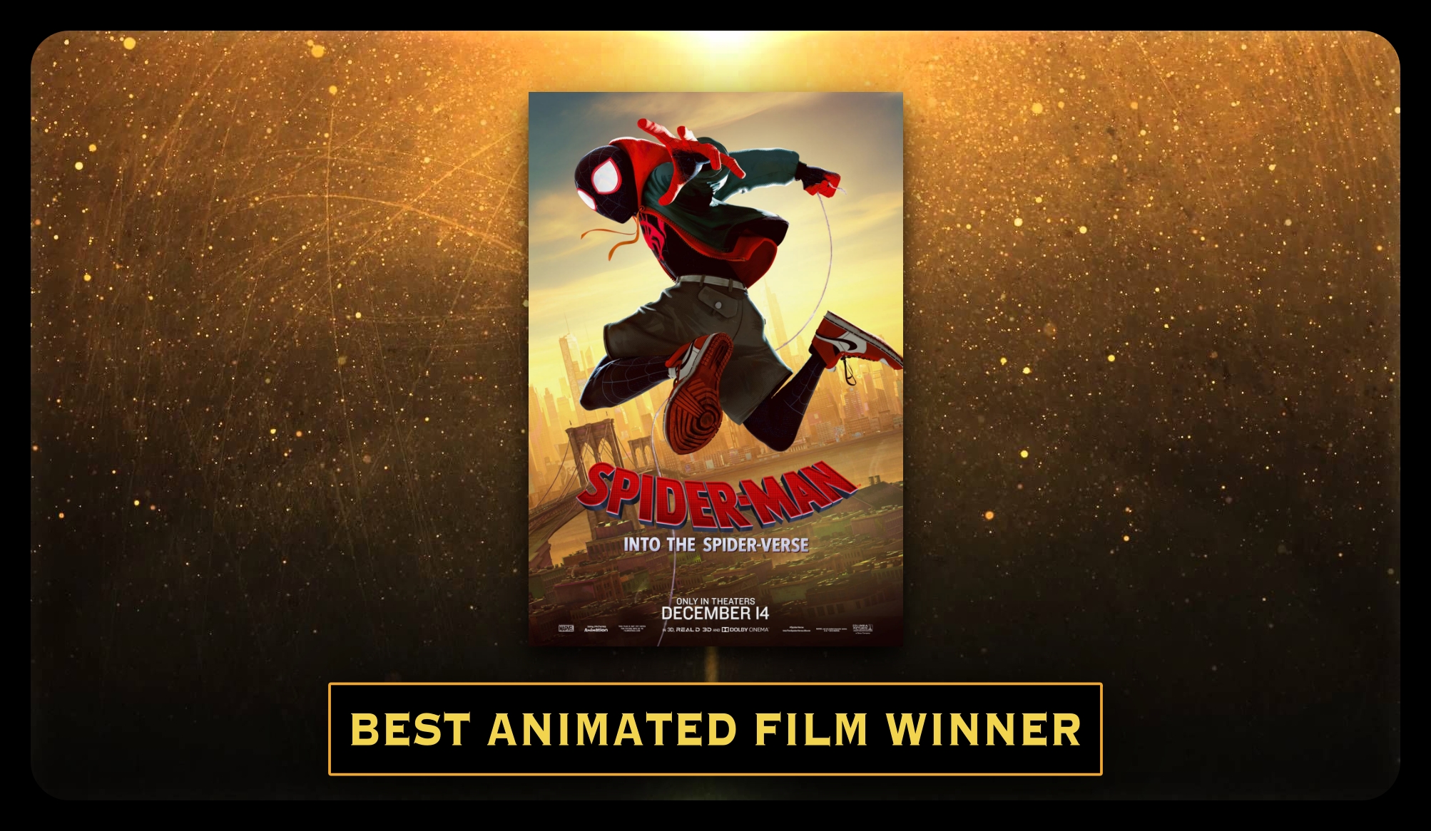 Juicy Awards VII- Best Animated Film Winner January 7, 2020 · by Harrison · in January, Juicy Awards VII. · BEST ANIMATED FILM WINNER: With its comic-book style animation, wonderful characters, and fun storyline, it’s hard not to give the win to “Spider-Man: Into the Spider-Verse.” Go see it if you haven’t! Share this: Click to share on X (Opens in new window) X Like Loading... Related