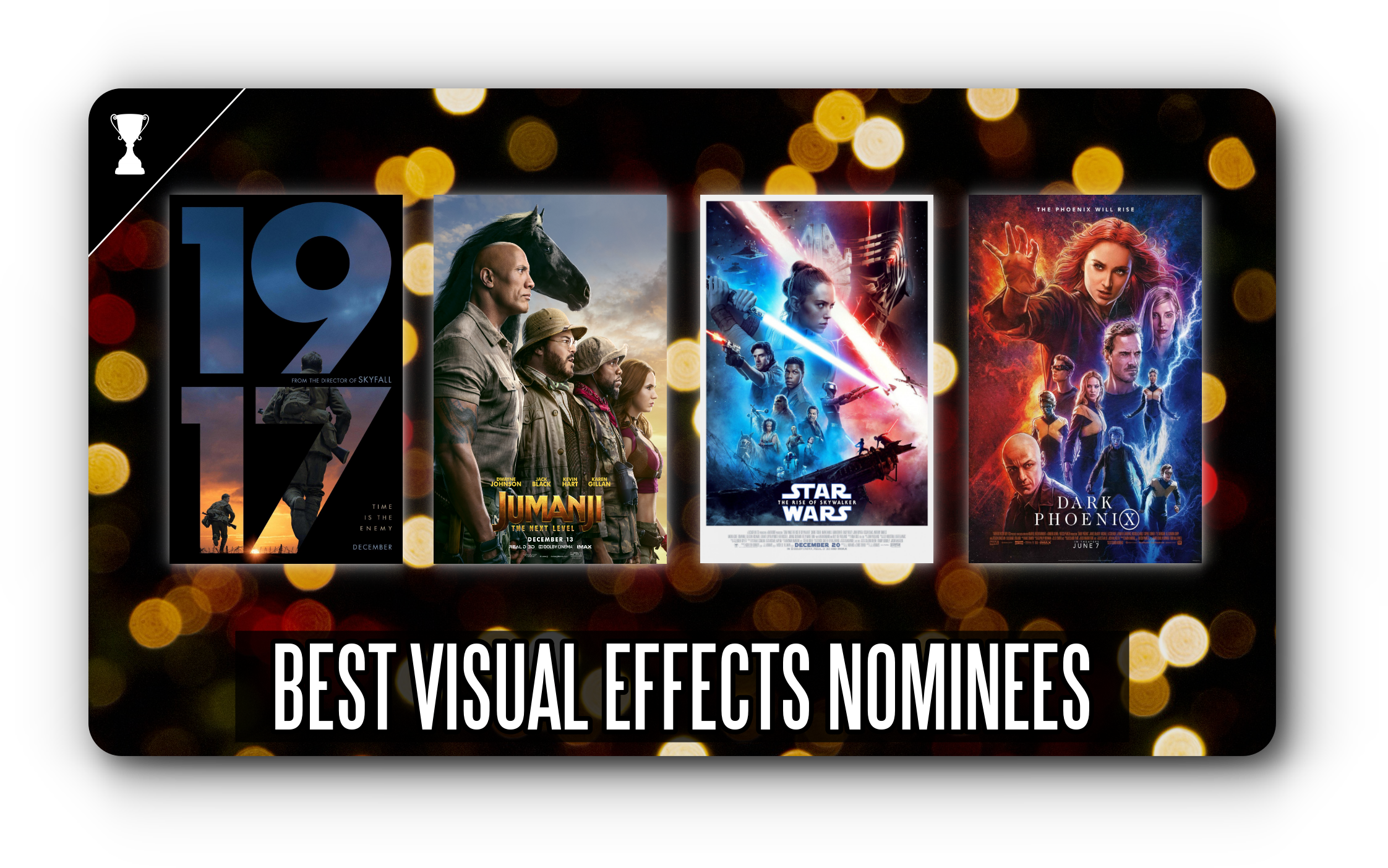 Juicy Awards VIII – Best Visual Effects Nominees January 11, 2021 · by Harrison · in January, Juicy Awards VIII. · BEST VISUAL EFFECTS NOMINEES: Each title is hyperlinked to a VFX breakdown video of the respective film. “1917”“Jumanji: The Next Level”“Star Wars: Episode IX – The Rise of Skywalker”“X-Men: Dark Phoenix” Share this: Click to share on X (Opens in new window) X Like Loading... Related