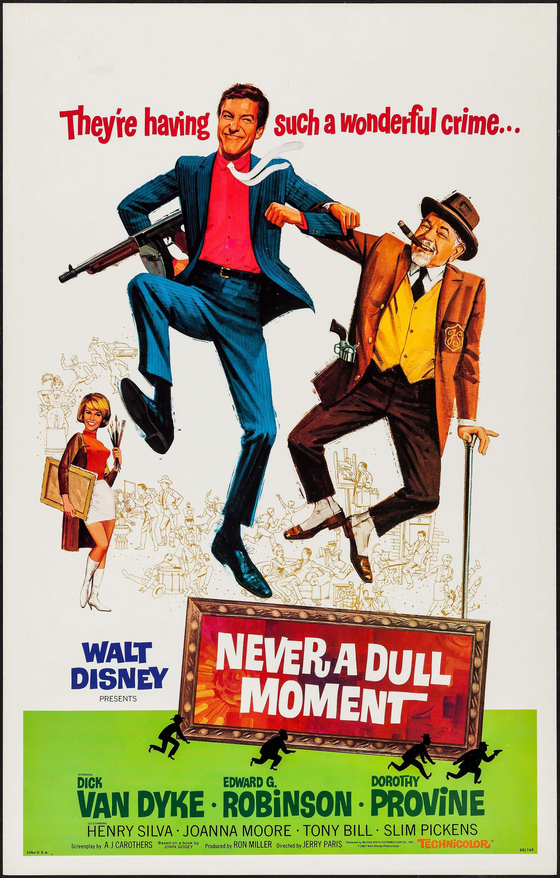 MOVIE REVIEW: “Never a Dull Moment” stars Dick Van Dyke (Mary Poppins Returns, Chitty Chitty Bang Bang), Edward G. Robinson (Double Indemnity, Key Largo), Dorothy Provine (It’s a Mad Mad Mad Mad World, The Great Race), Henry Silva (The Manchurian Candidate, Ghost Dog: The Way of the Samurai), Joanna Moore (Touch of Evil, Countdown), Tony Bill (Shampoo, Must Love Dogs), Slim Pickens (Blazing Saddles, The Getaway), Jack Elam (Once Upon a Time in the West, The Cannonball Run), Ned Glass (West Side Story [1961], Charade), Richard Bakalyan (Chinatown, The Fox and the Hound), and Philip Coolidge (North by Northwest, Inherit the Wind). It is directed by Jerry Paris (Happy Days [TV series], The Odd Couple [1970 TV series]), with the screenplay being written by AJ Carothers (The Secret of My Success, Emil and the Detectives).