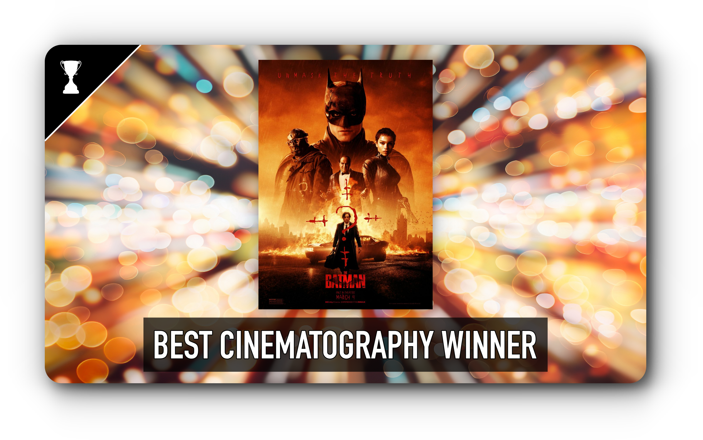 Greig Fraser was nominated twice for a reason. The man is a visual genius, and with 2022’s “The Batman,” he gives us the most realistic representation of Gotham ever. Period. His use of shadows and crushed blacks bleed beautifully onscreen, especially when they contrast the more colorful pulp of rising suns and burning cars. I loved the look of this new Batman flick; the cinematography alone makes it well worth the watch.